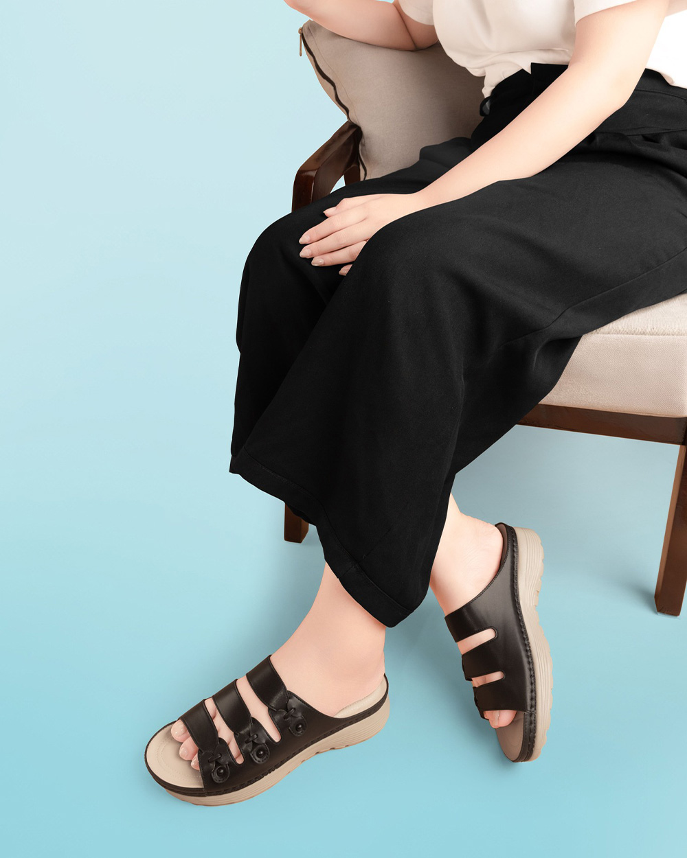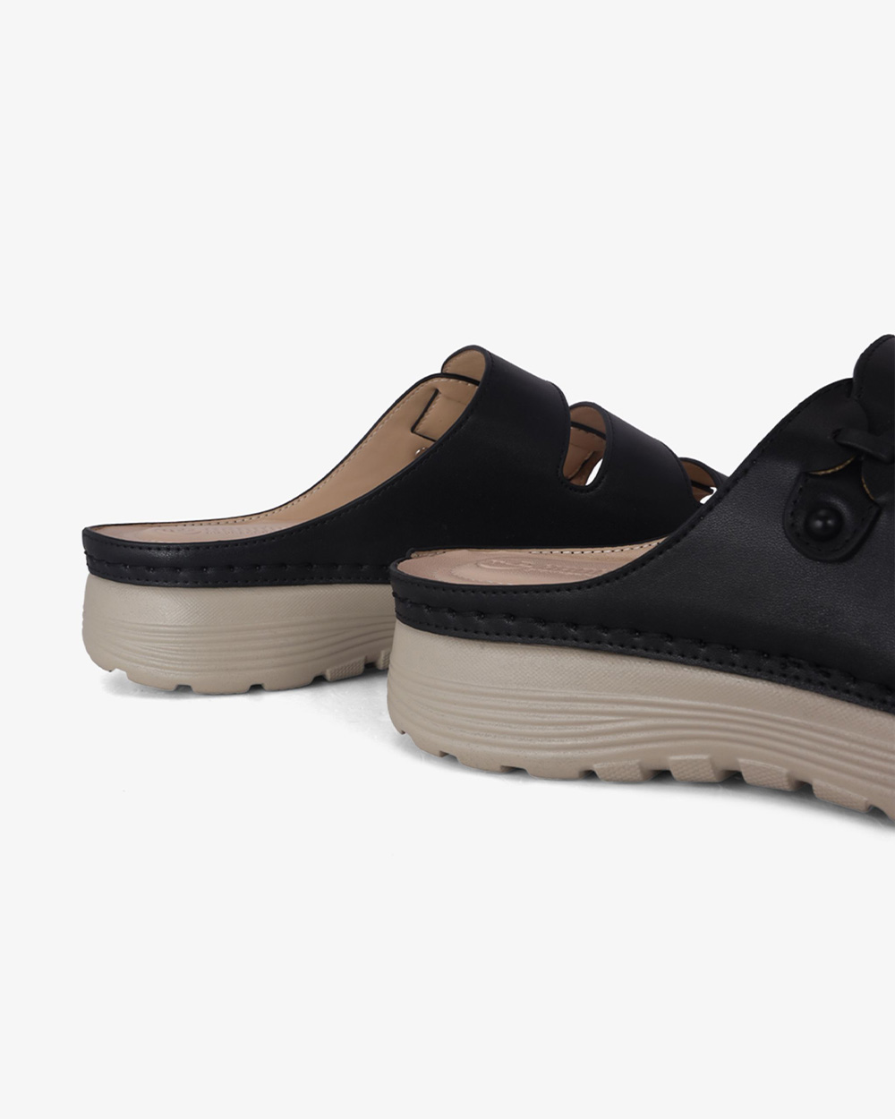 Gót cao 4cm dạng trụ vững chắc. Mặt đế có các rãnh chống trơn trượt, giữ chân chắc chắn mà vẫn thoải mái.