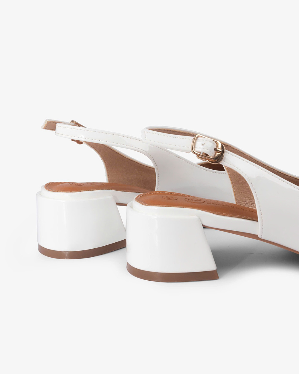 Gót cao 4cm dạng trụ vững chắc. Mặt đế có các rãnh chống trơn trượt, giữ chân chắc chắn mà vẫn thoải mái.