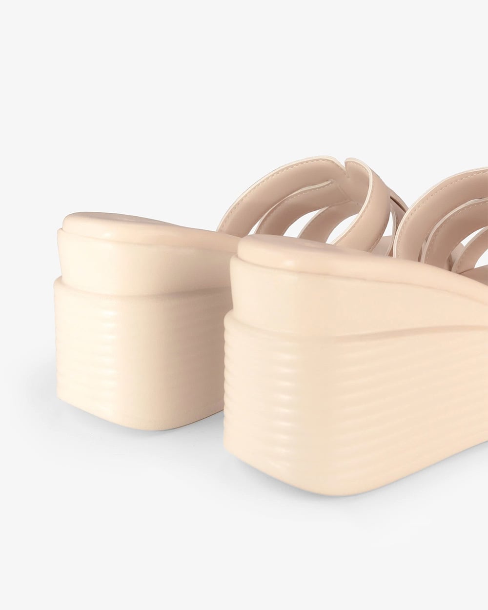 Gót cao 8cm dạng trụ vững chắc. Mặt đế có các rãnh chống trơn trượt, giữ chân chắc chắn mà vẫn thoải mái.