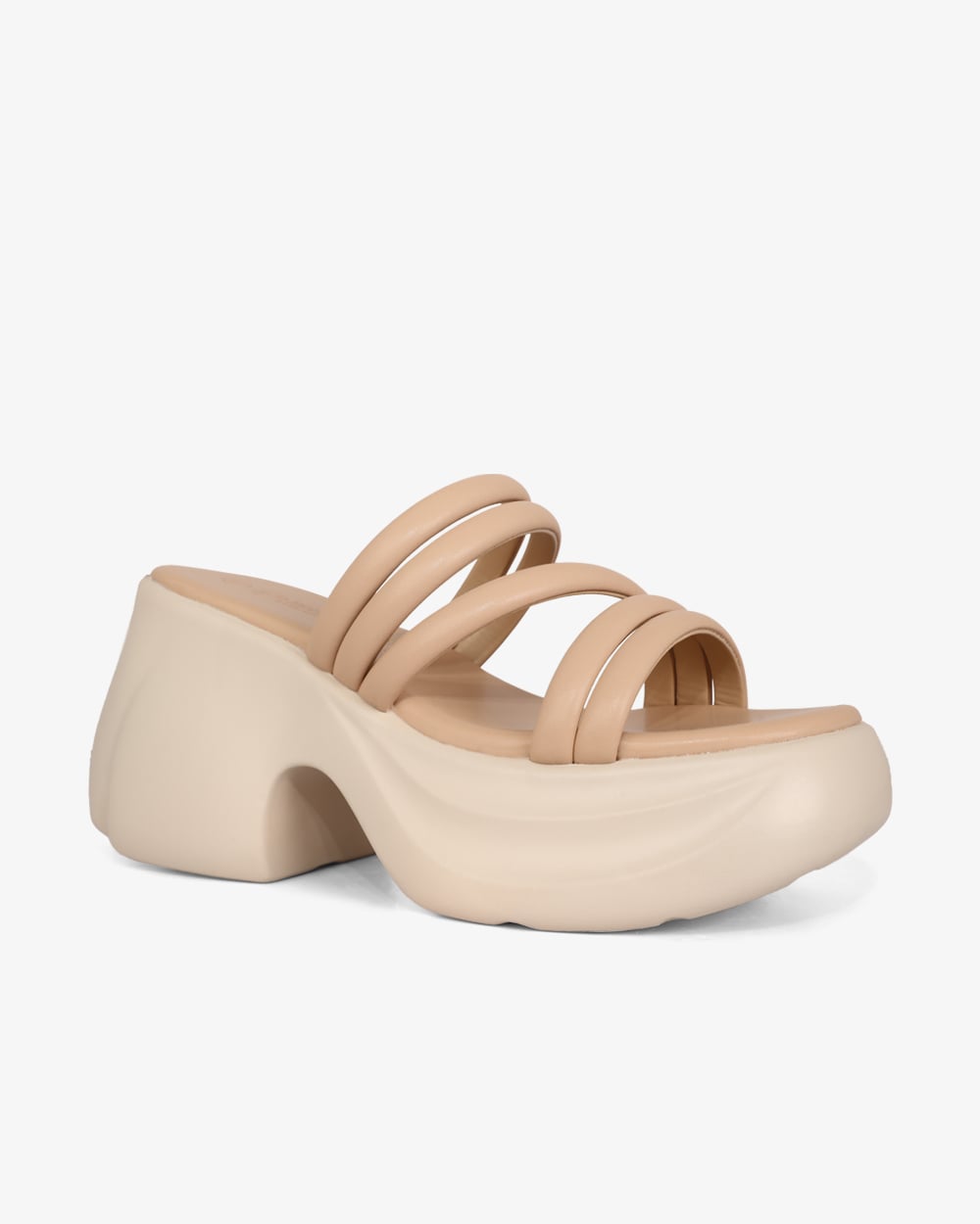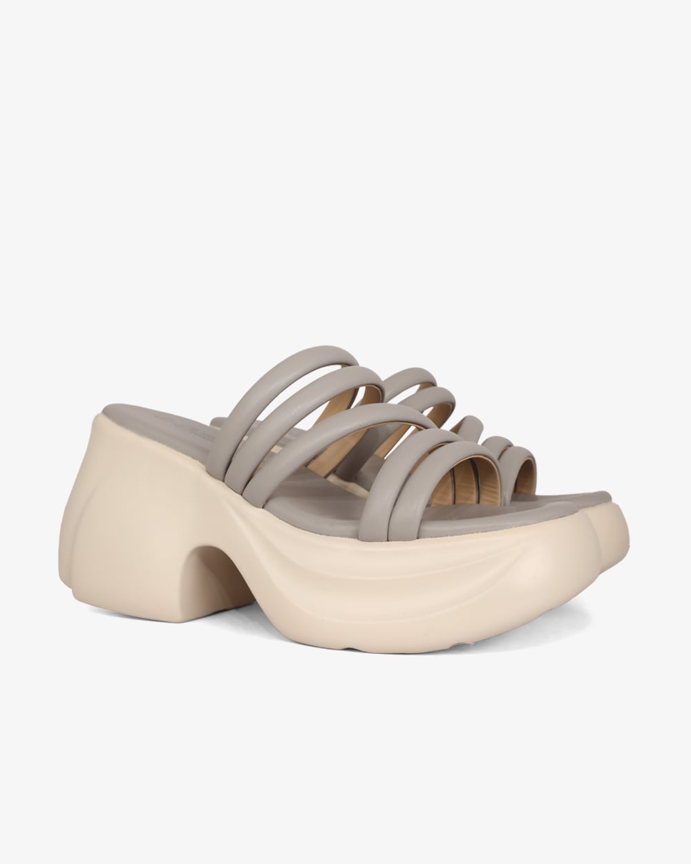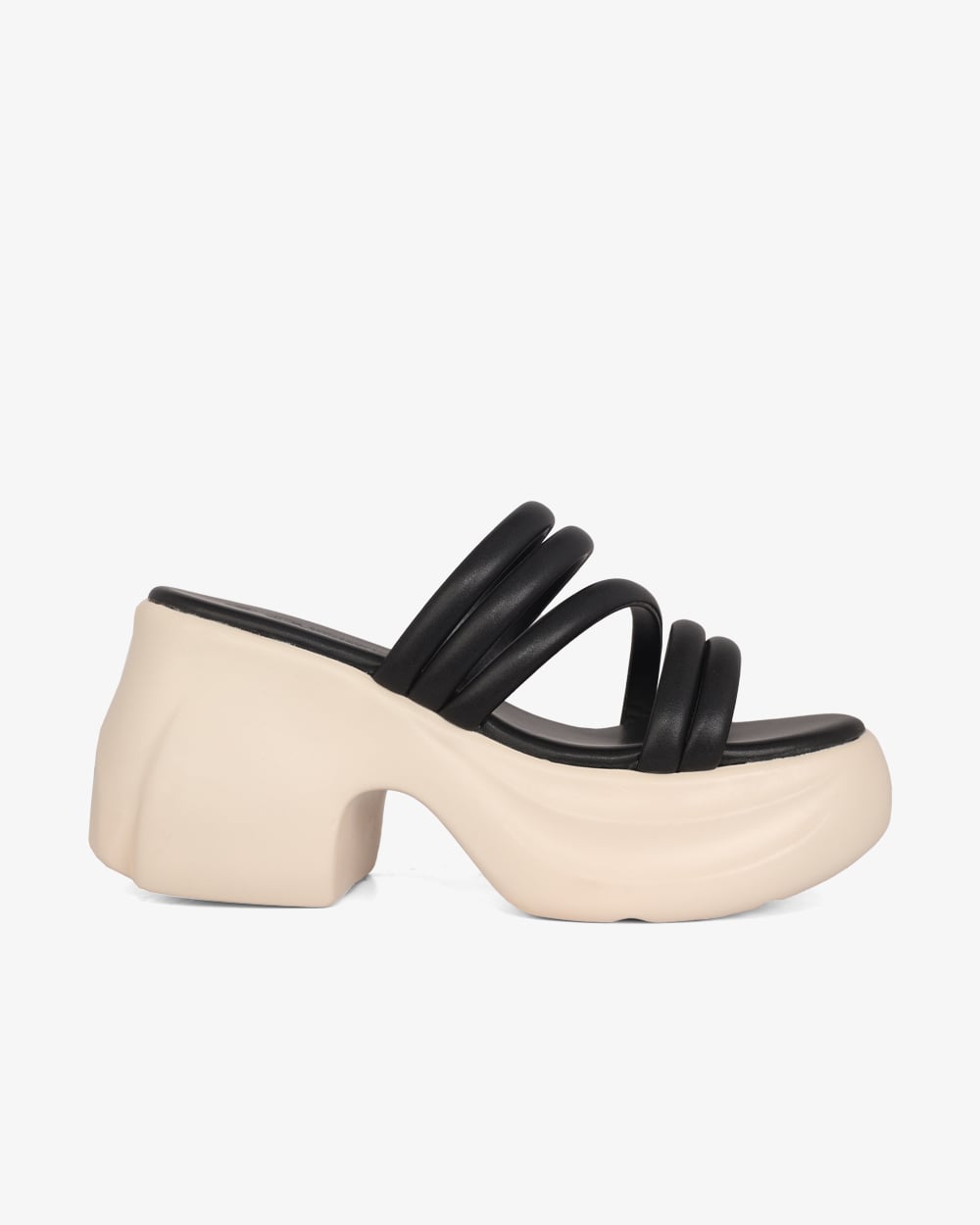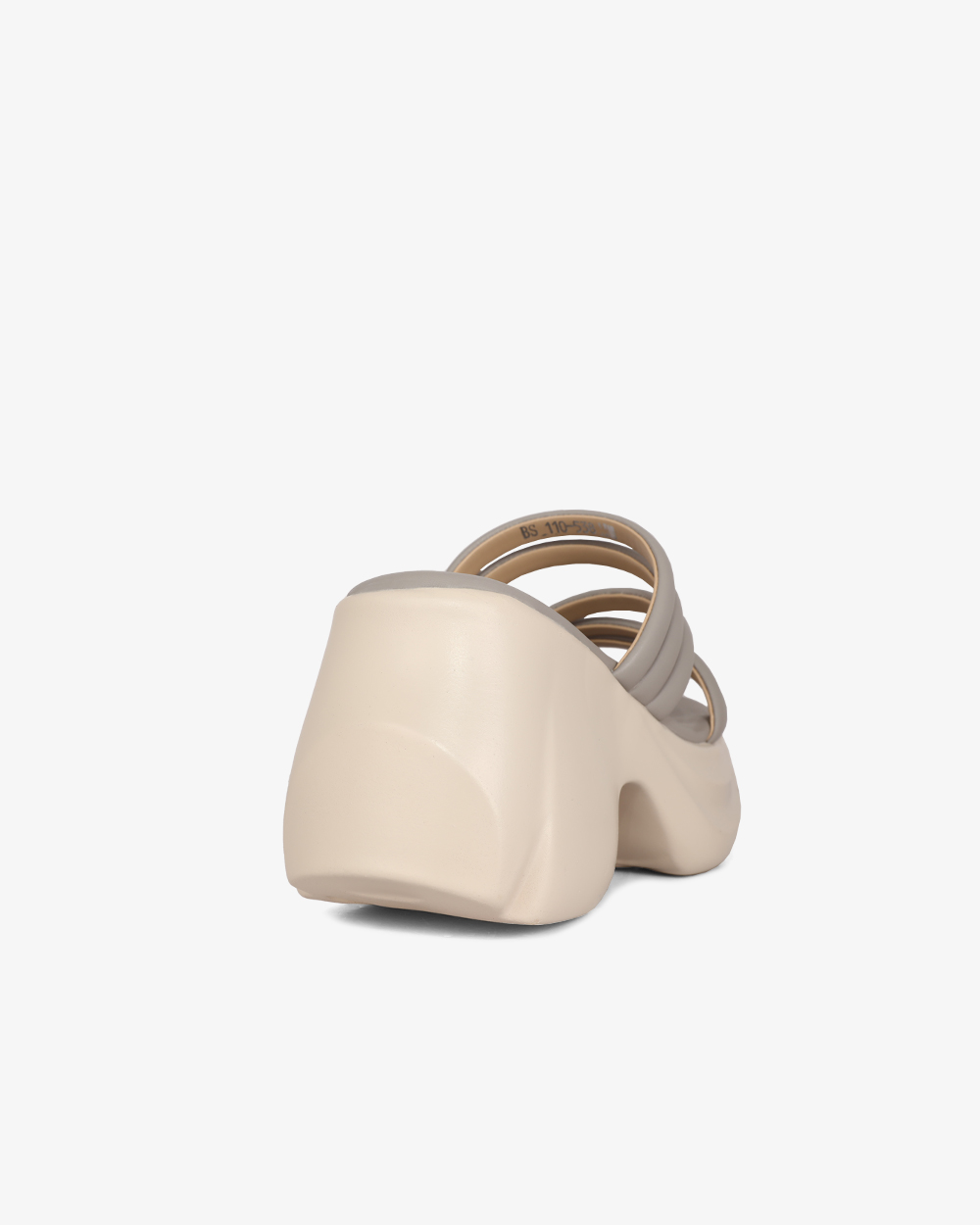 Gót cao 10cm dạng trụ vững chắc. Mặt đế có các rãnh chống trơn trượt, giữ chân chắc chắn mà vẫn thoải mái.