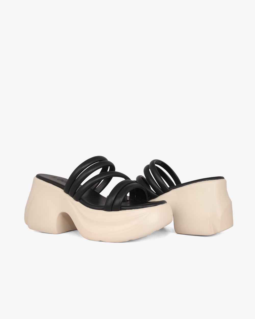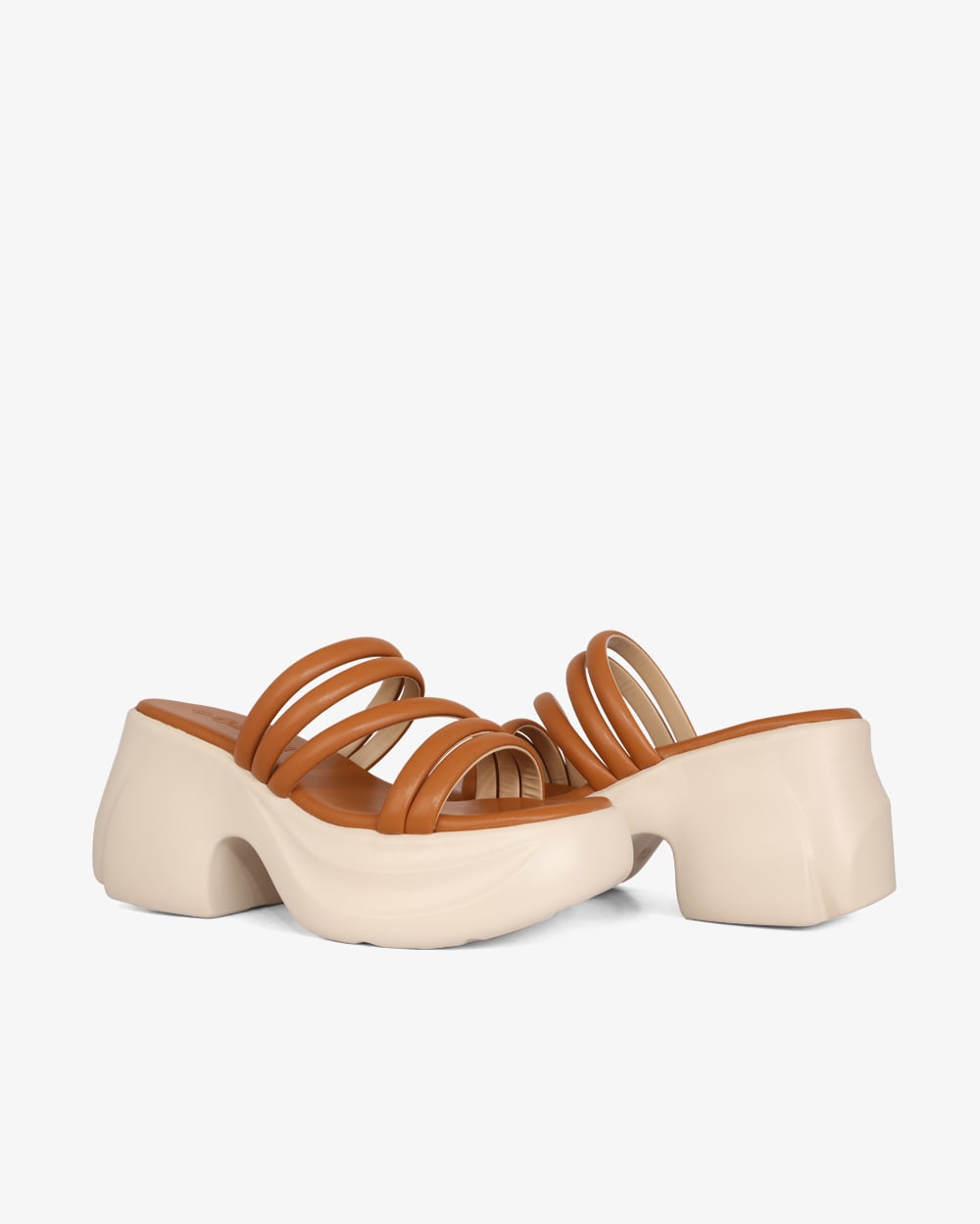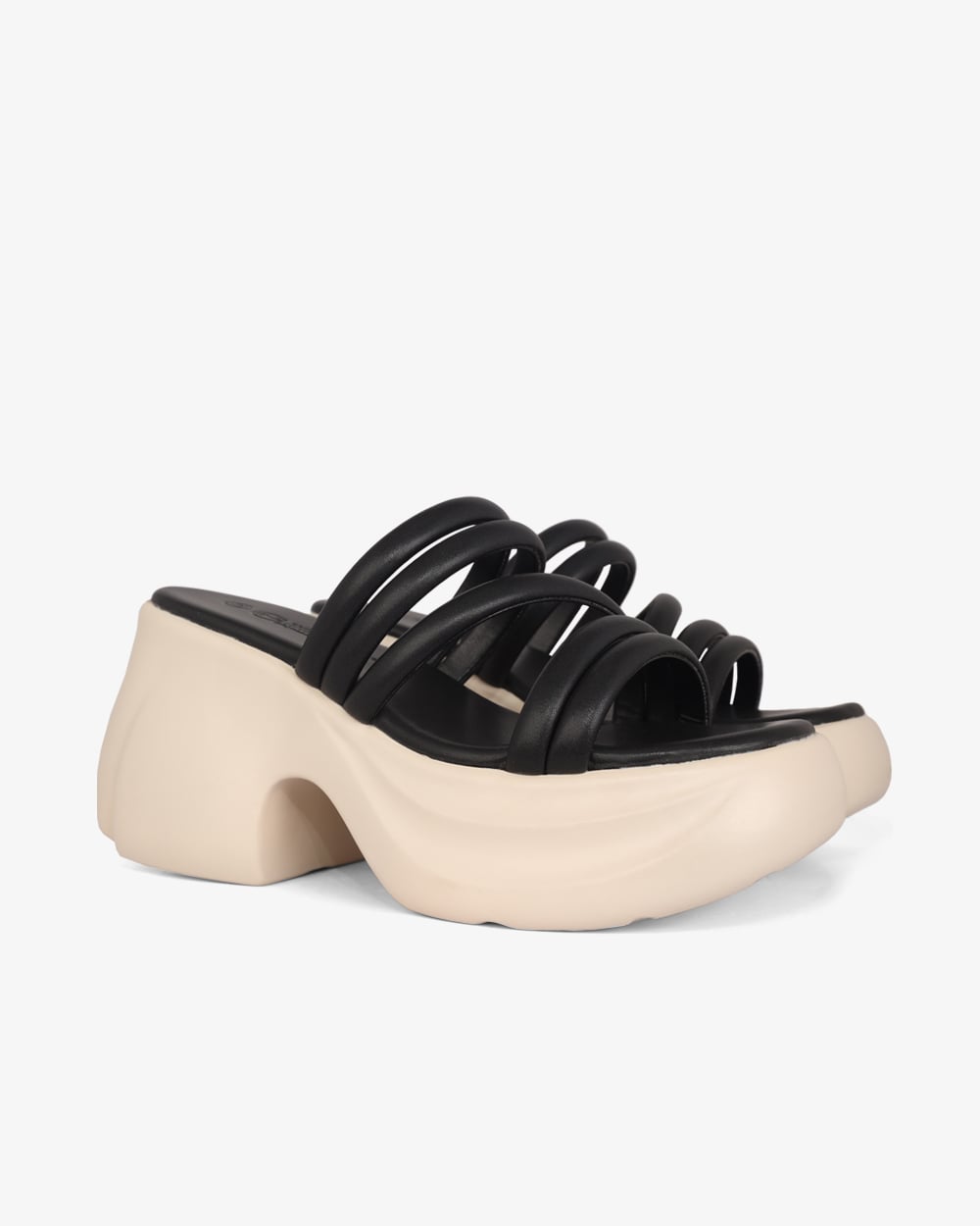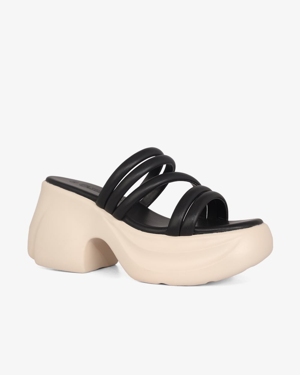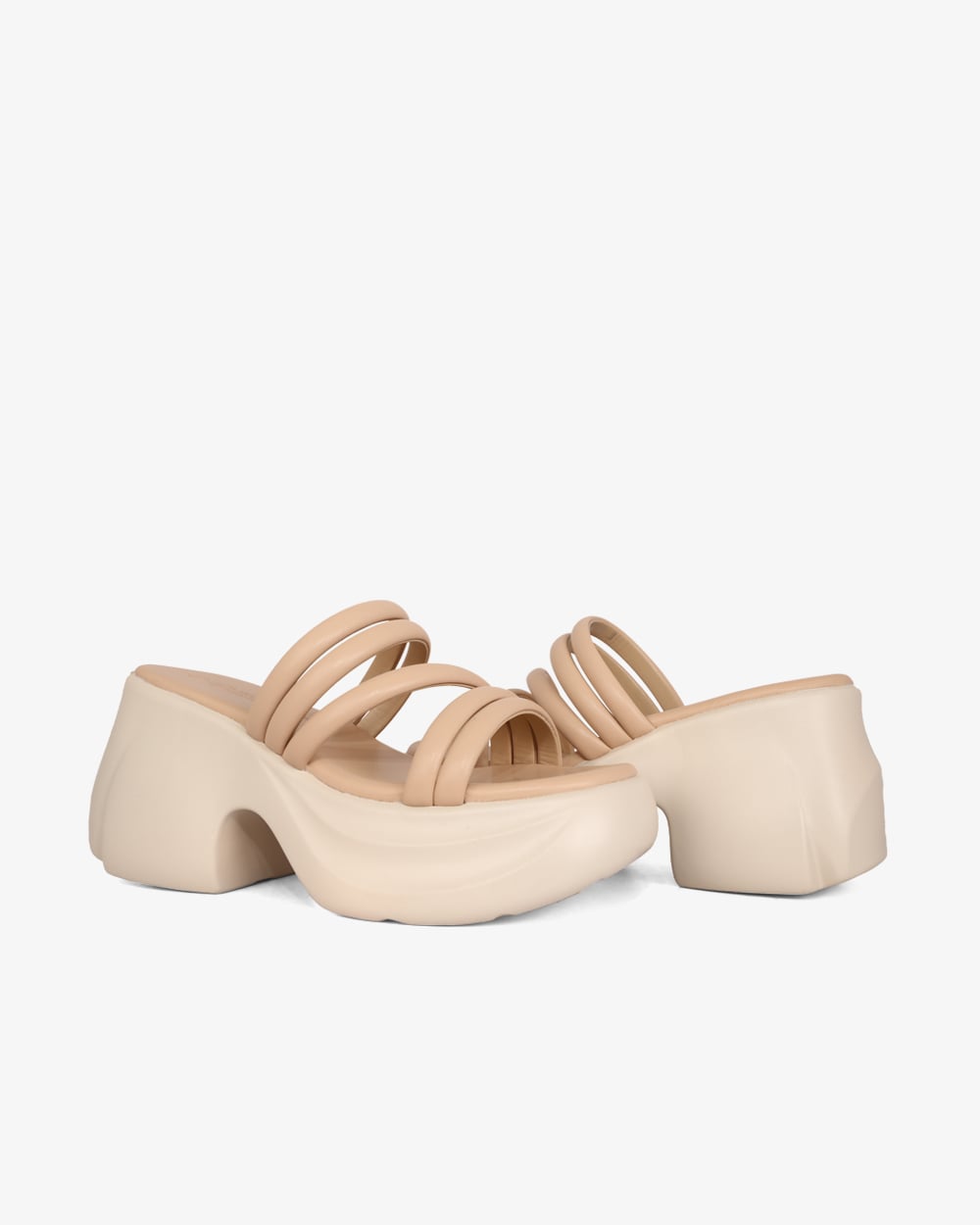 Gót cao 10cm dạng trụ vững chắc. Mặt đế có các rãnh chống trơn trượt, giữ chân chắc chắn mà vẫn thoải mái.