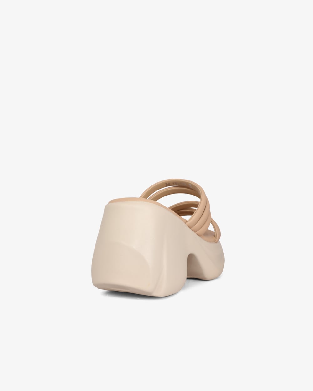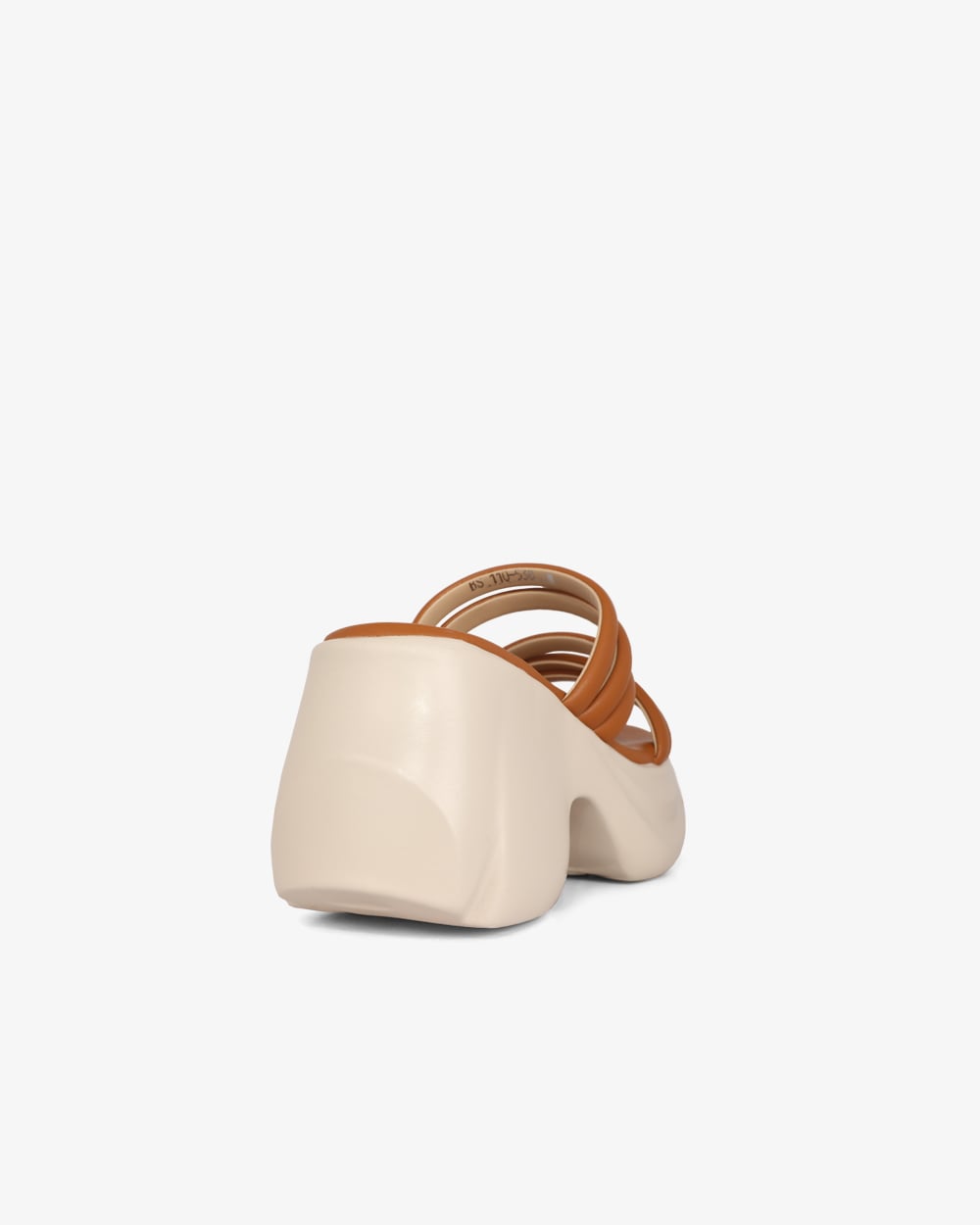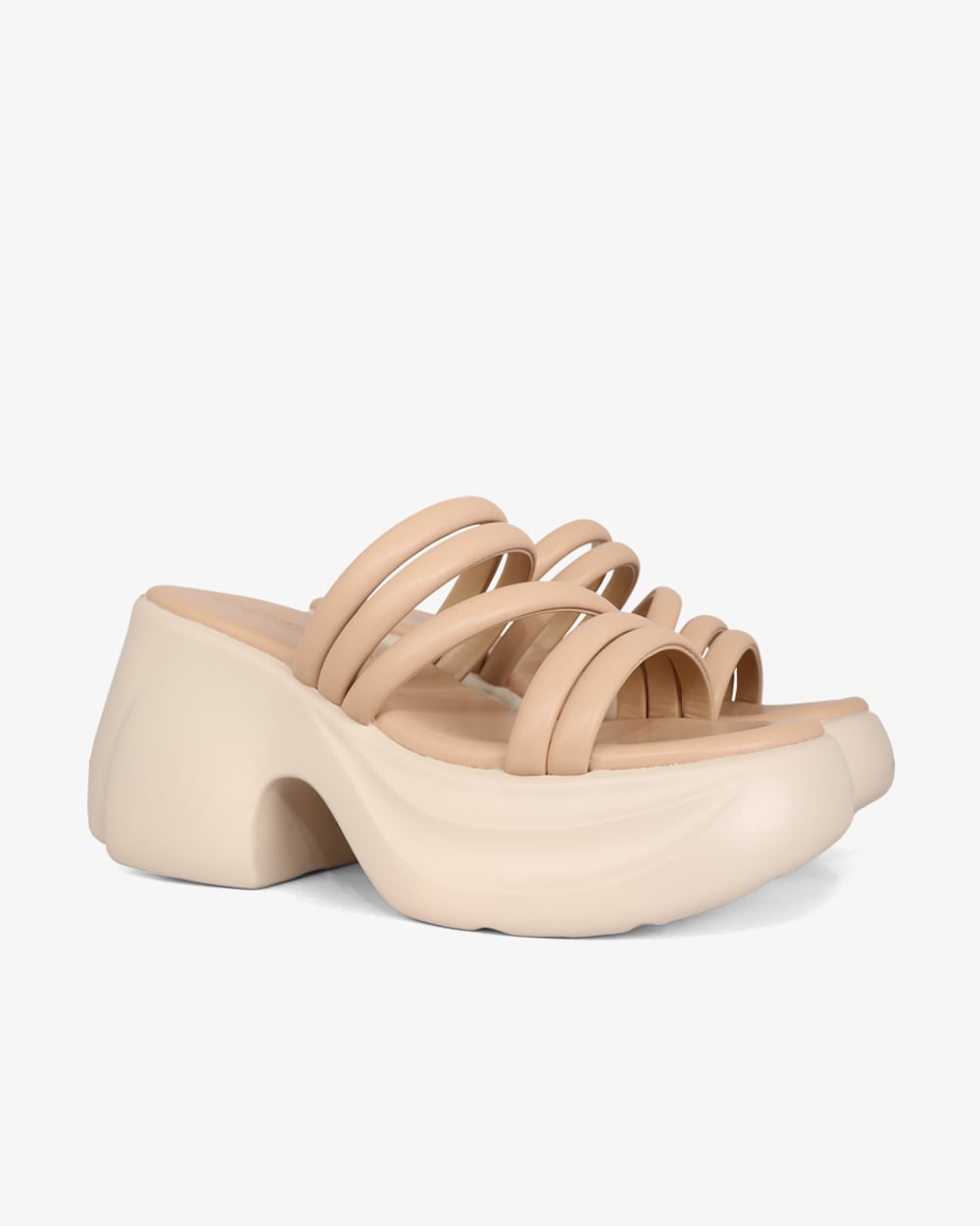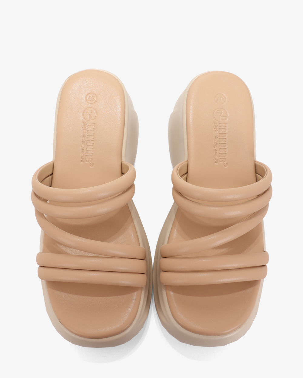 Gót cao 10cm dạng trụ vững chắc. Mặt đế có các rãnh chống trơn trượt, giữ chân chắc chắn mà vẫn thoải mái.