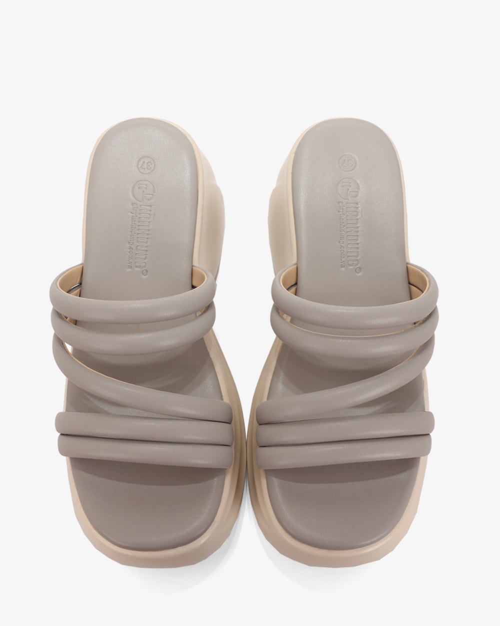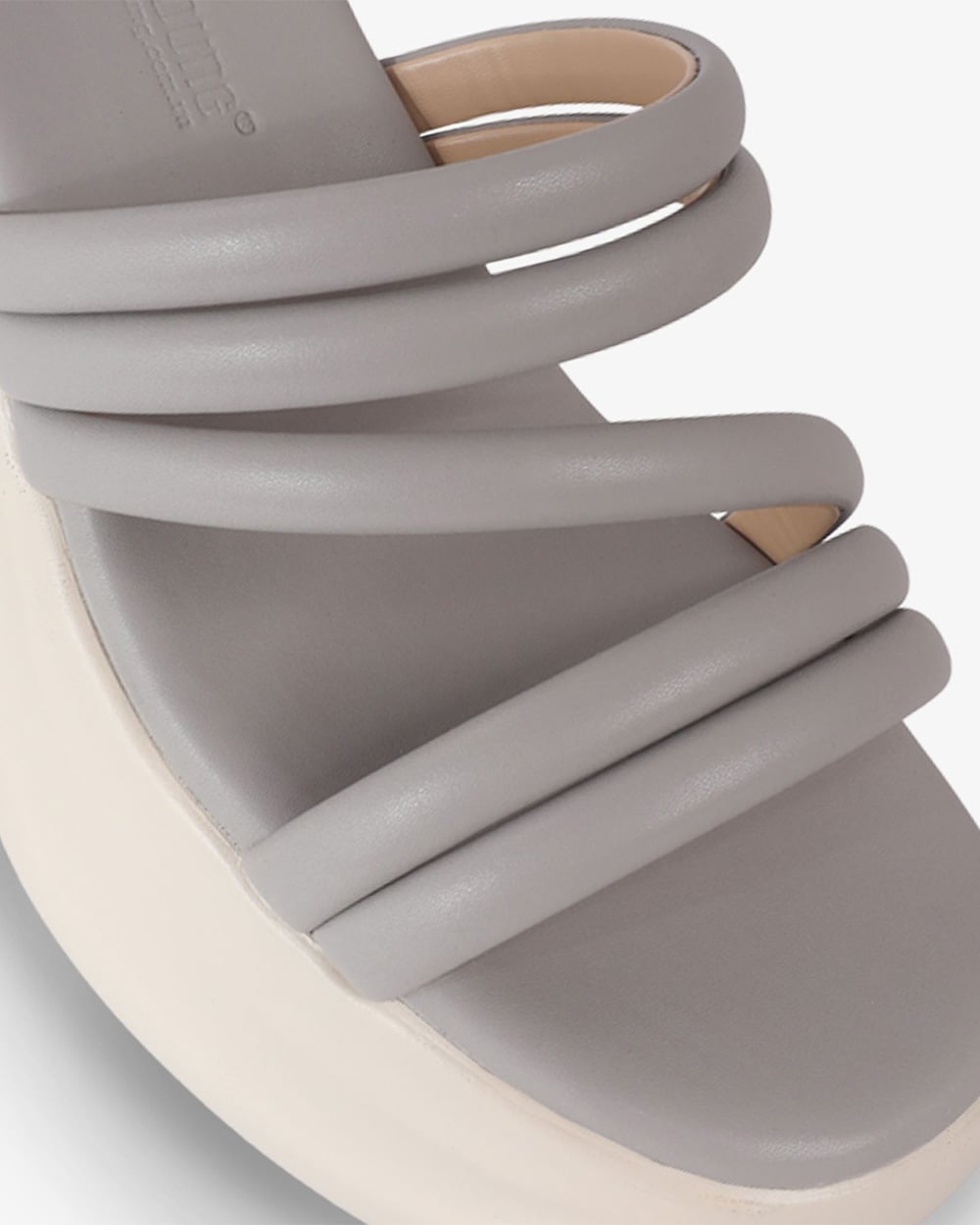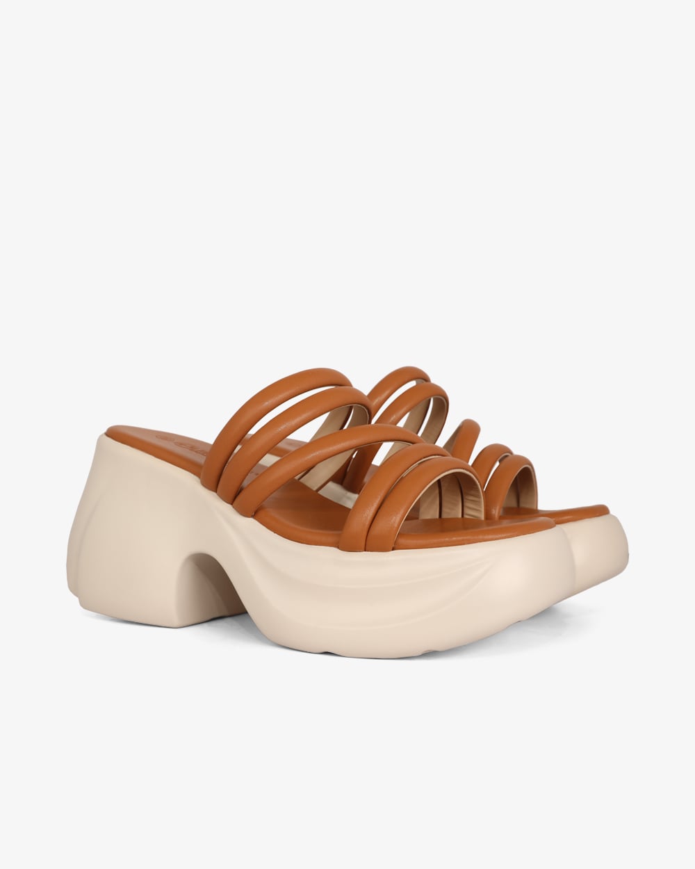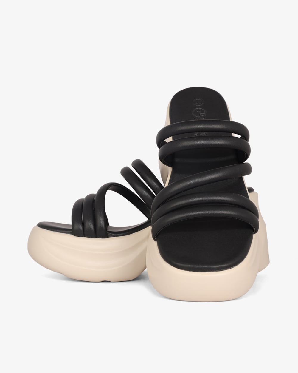Gót cao 10cm dạng trụ vững chắc. Mặt đế có các rãnh chống trơn trượt, giữ chân chắc chắn mà vẫn thoải mái.